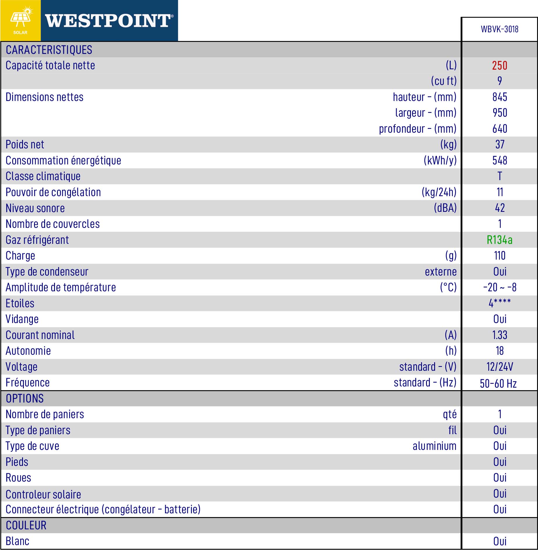 Congélateur Solaire de 9cu ft/ 250L + Contrôleur Solaire + Câble de Connexion Westpoint
