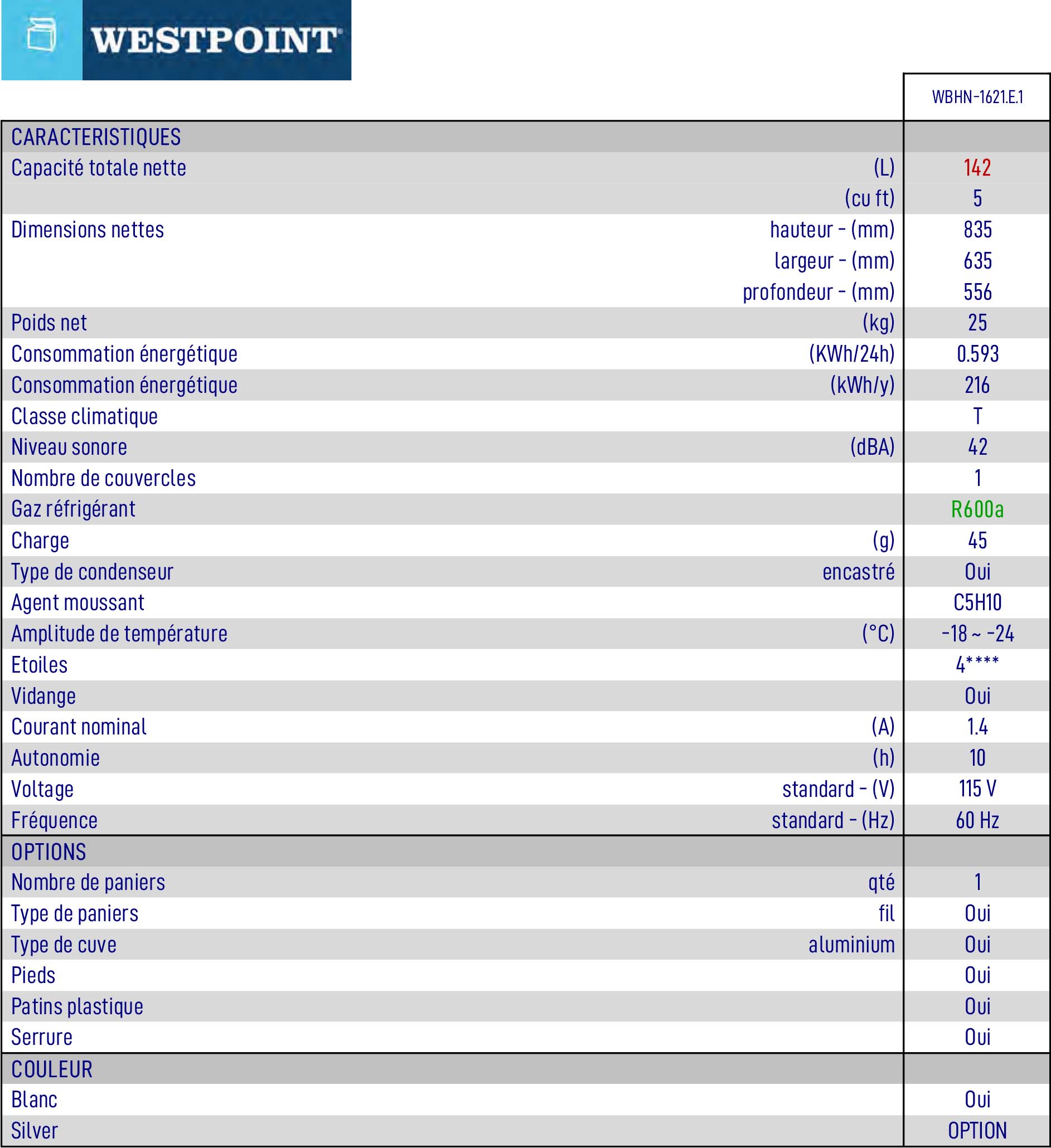 Congélateur Coffre 5 pi³/142 L - Cuve en Aluminium - avec Serrure Westpoint