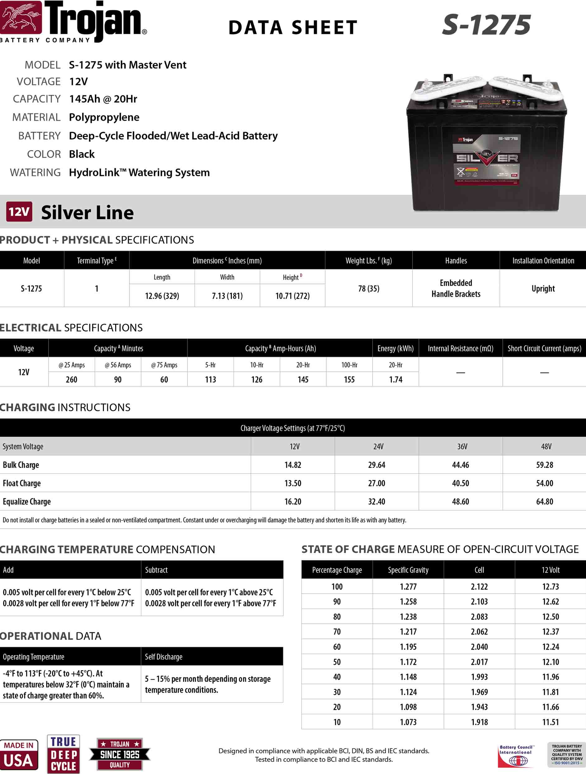 12 Volts 145 Amps Deep-Cycle Flooded/ Wet Lead-Acid Battery Trojan